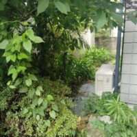 現地調査をさせて頂いたときに、庭木も高くなり電線に届いてしまいそうということで、生垣以外にも剪定をご依頼頂きました。家周りやお庭には雑草も伸びてしまっており、ジメジメとして蚊も大量に発生してしまっていたので、除草も含めたプランを作成させて頂き、ご依頼頂きました。