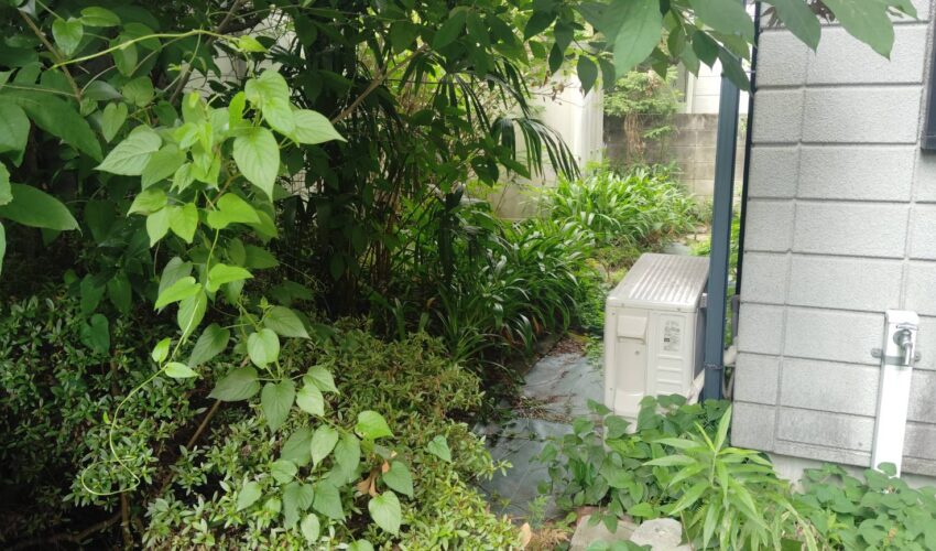 T様邸も7月の初旬にも関わらず、雑草はかなりの背丈になり、日陰部分には蚊が多く、ジメジメしてしまっていました。